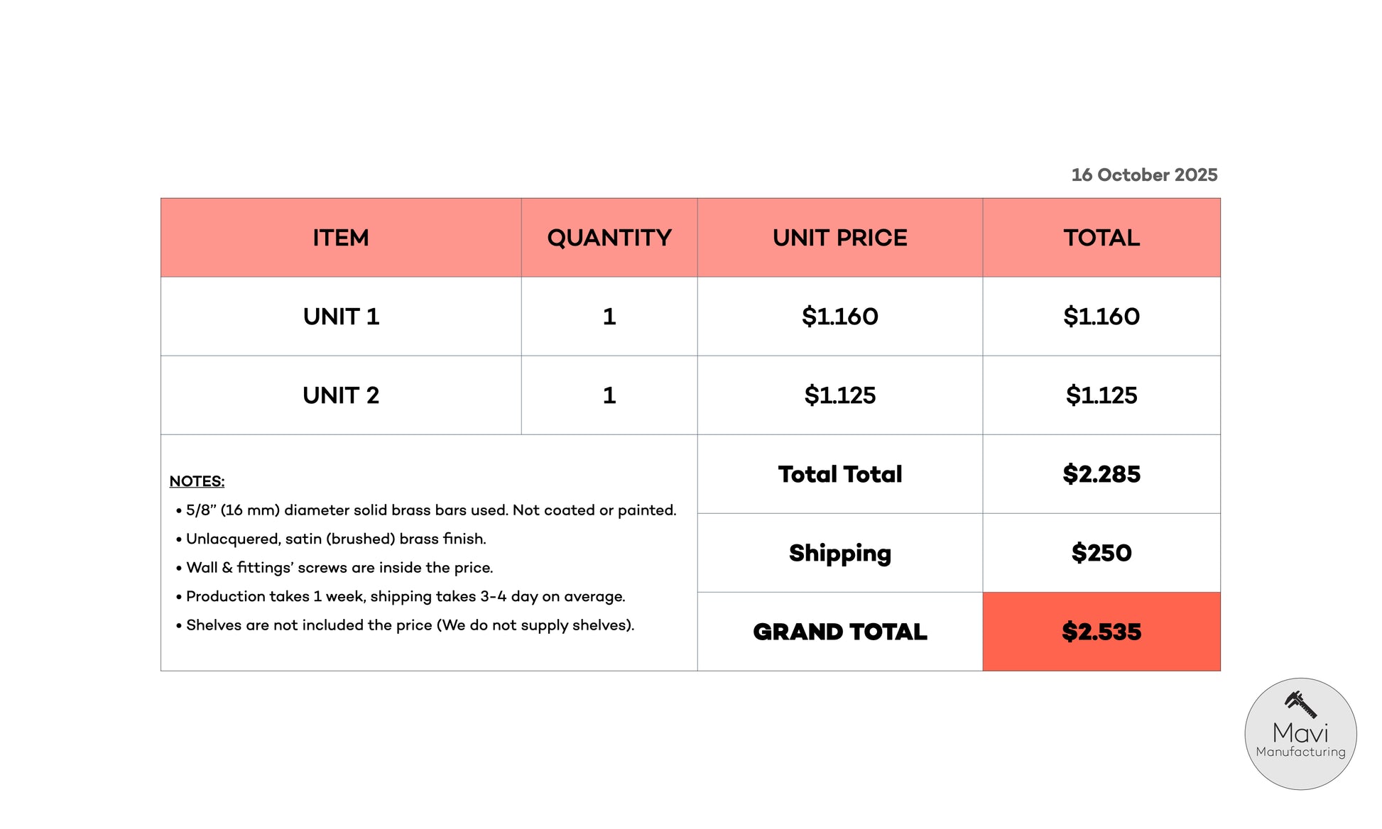 - Production takes 1 week, shipping takes 3-4 day on average..