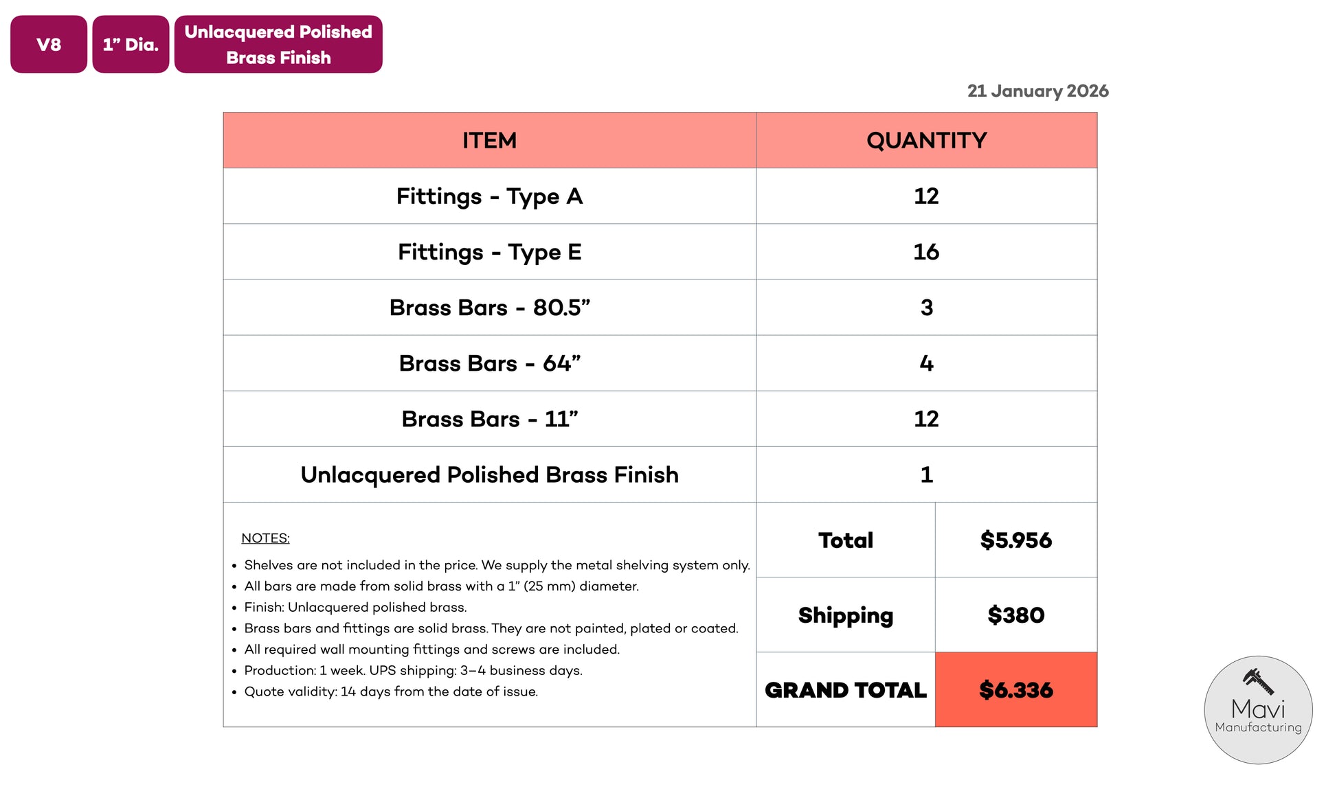 - All bars are made from solid brass with a 1” (25 mm) diameter.