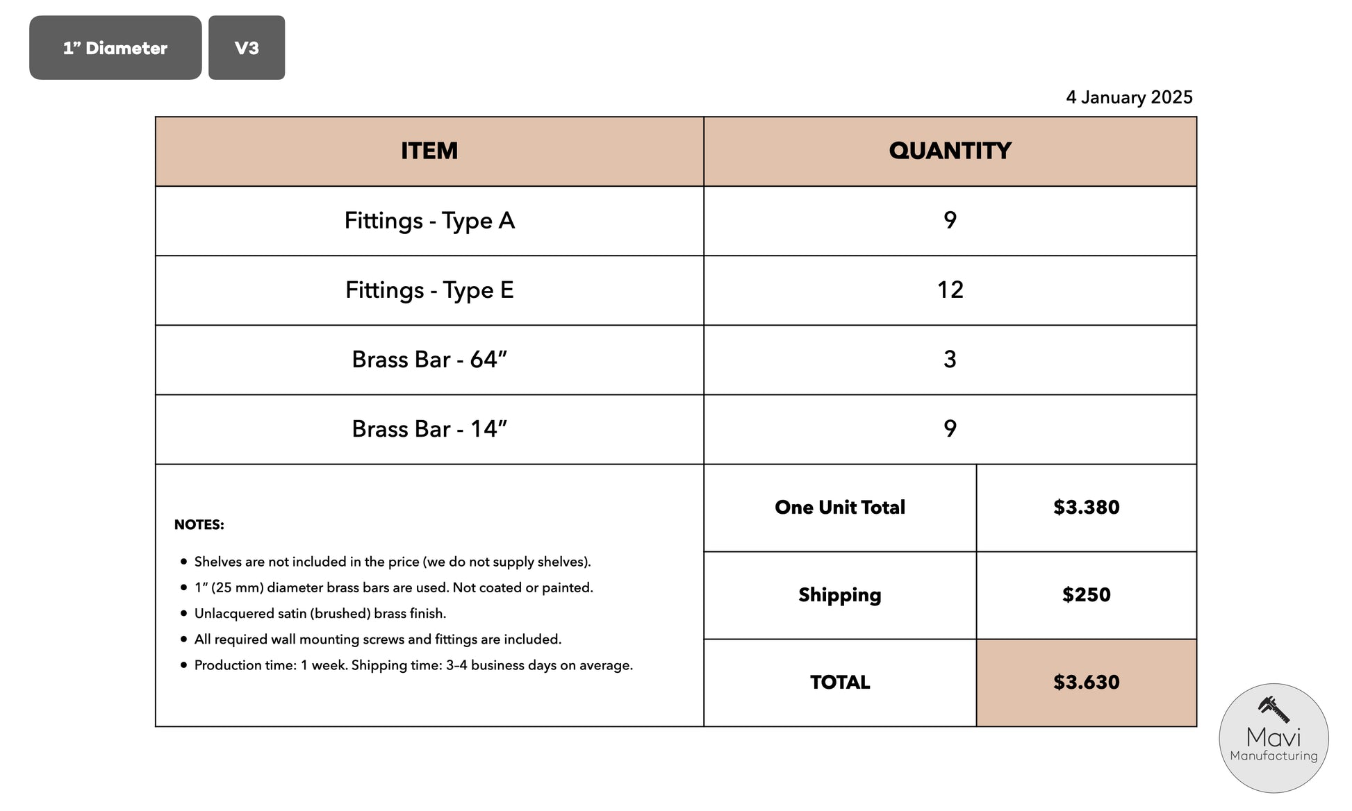 - Production: 1 week. UPS shipping: 3–4 business days.